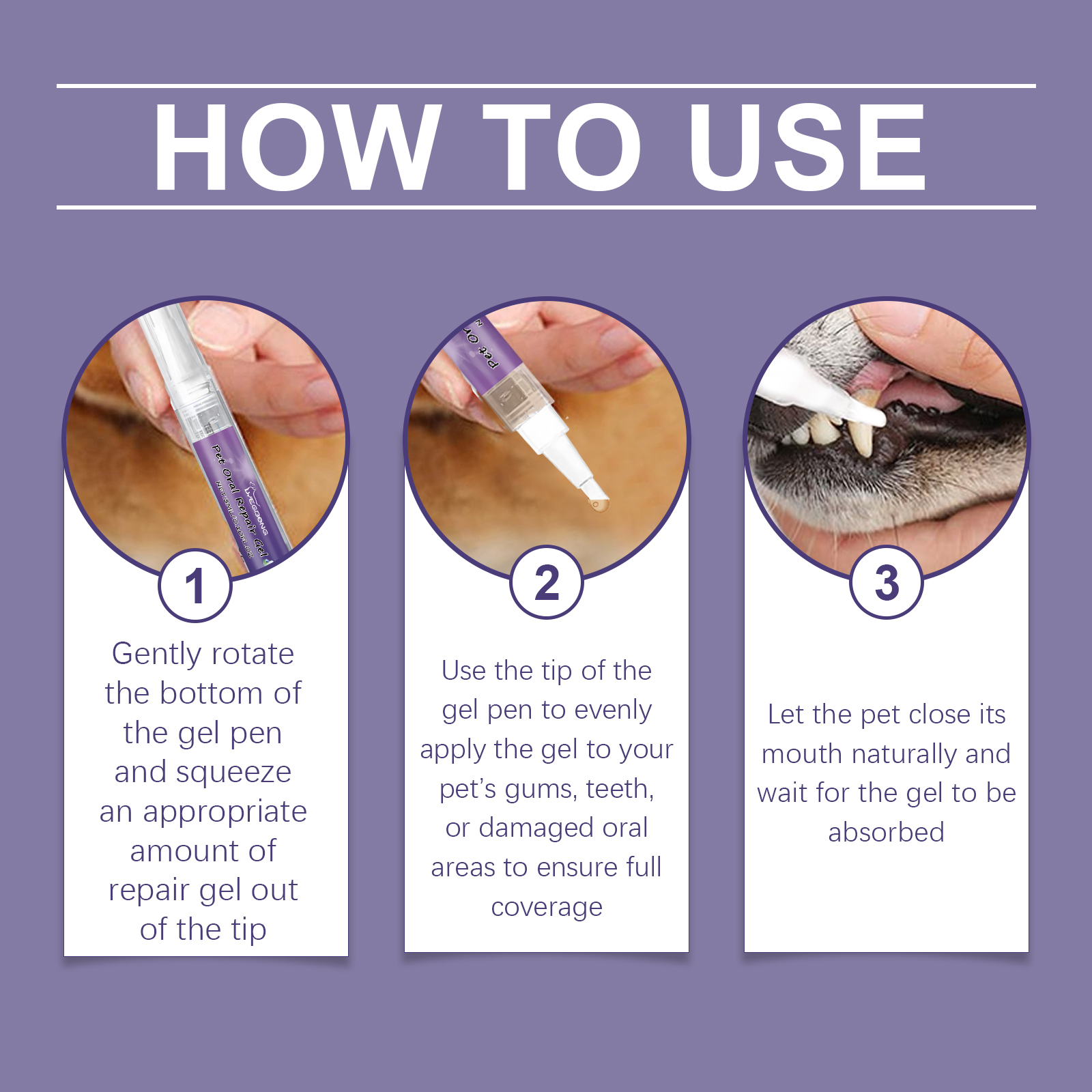 Our pet mouth repair gel contains oat extract, citric acid. It can effectively improve the oral health of pets. Its application is simple: gently rotate the bottom of the gel pen to squeeze out the right amount of repair gel, apply the gel evenly to your pet's gums, teeth or damaged oral area with the tip of the gel pen to ensure complete coverage, let your pet naturally close its mouth and wait for the gel to be absorbed. And the formula is mild, suitable for sensitive pets.